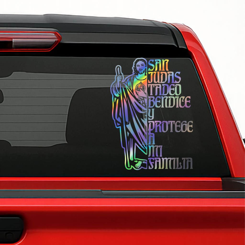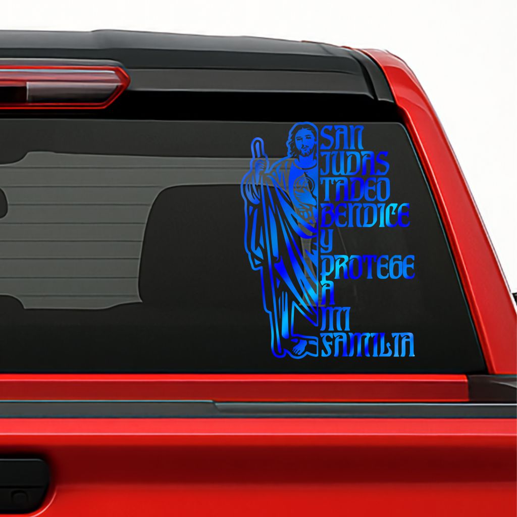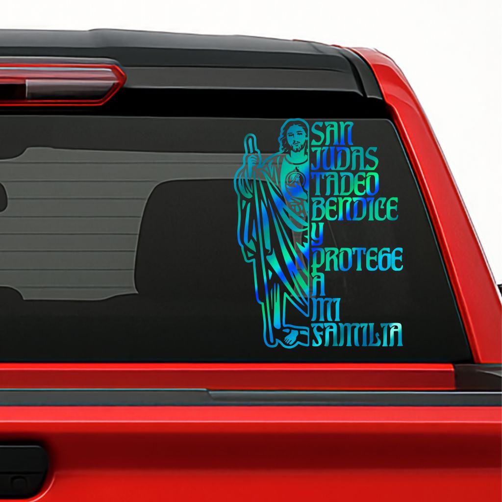 San Judas Tadeo Sticker – Bless & Protect My Family / Calcomanía en Vinil con Frase de Protección